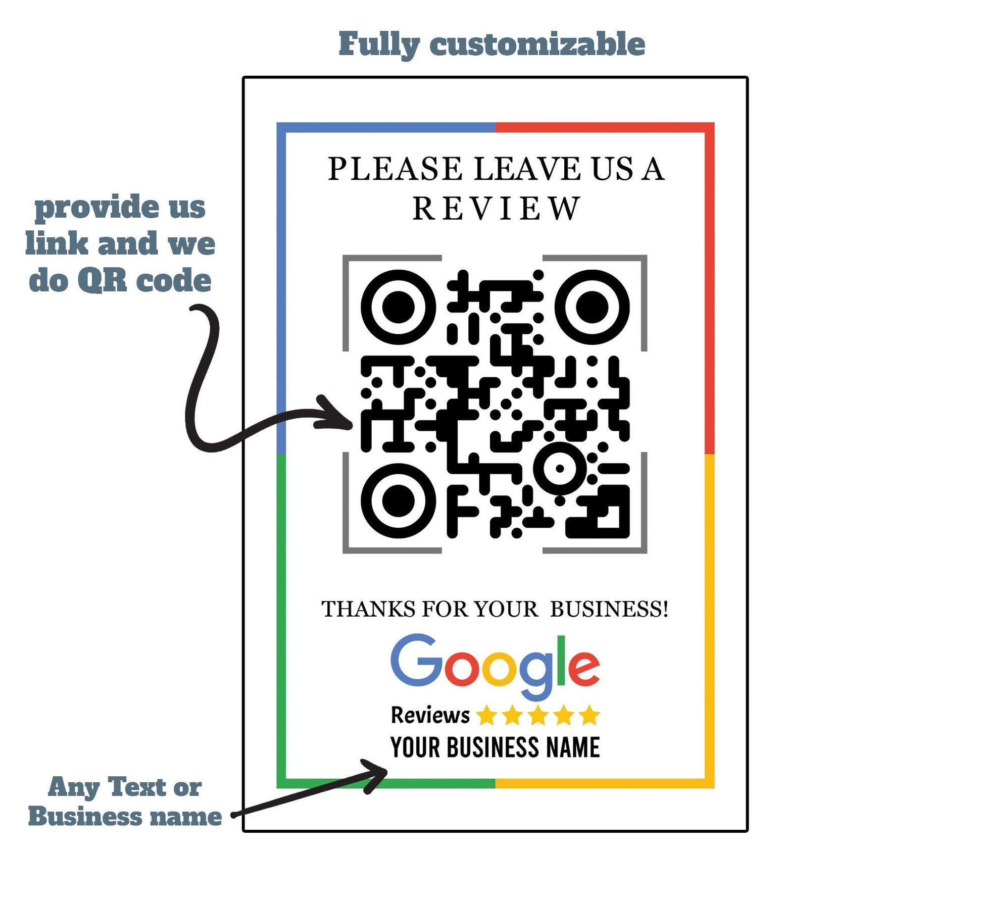 Help your customers quickly leave a review by scanning this sign with their phone. Just give us the web address that you want to link to, and we'll handle the rest.