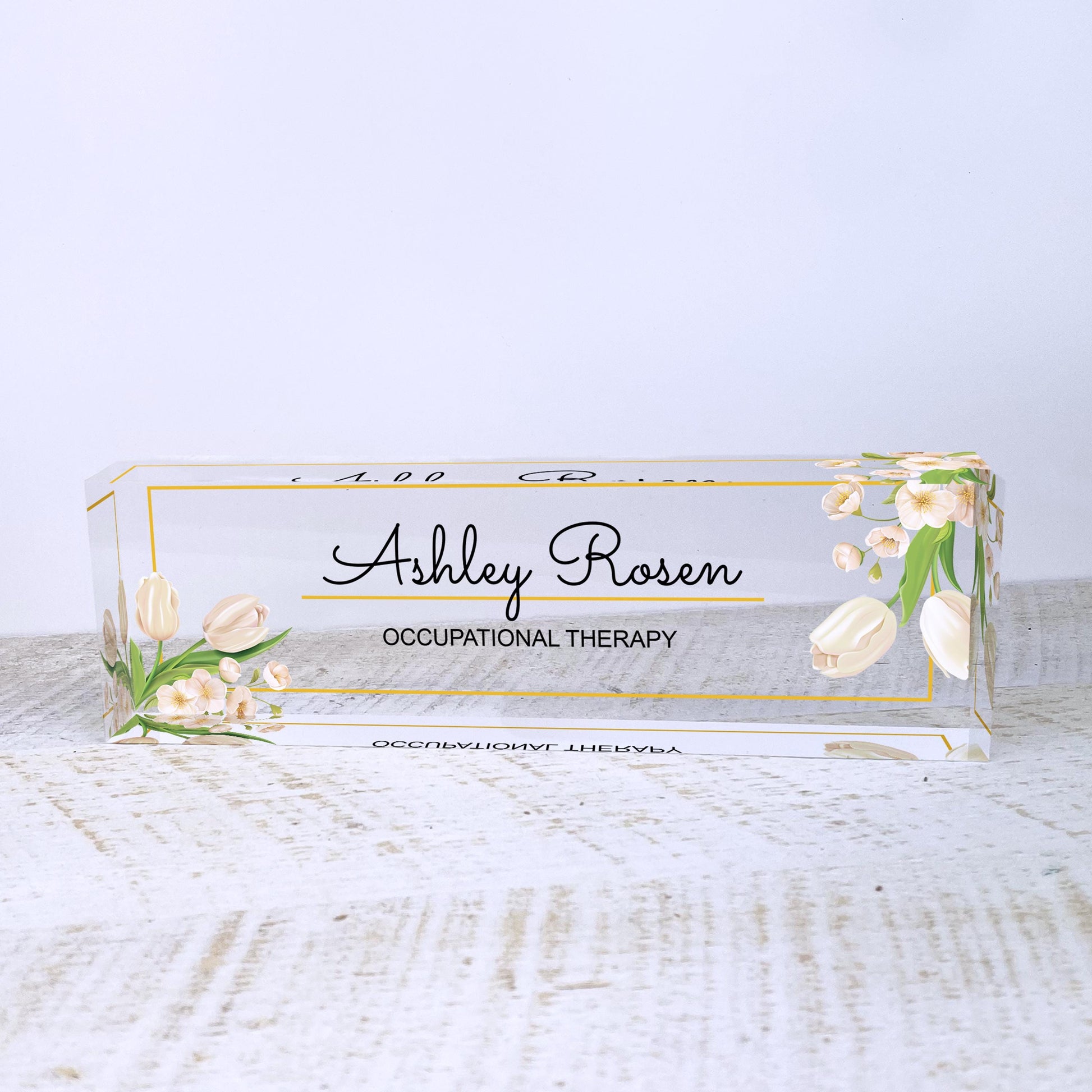 Personalized Name Plate for Desk | Flowers white Design On Clear Acrylic Glass | Custom Office Decor Nameplate Sign | Personalized Gift