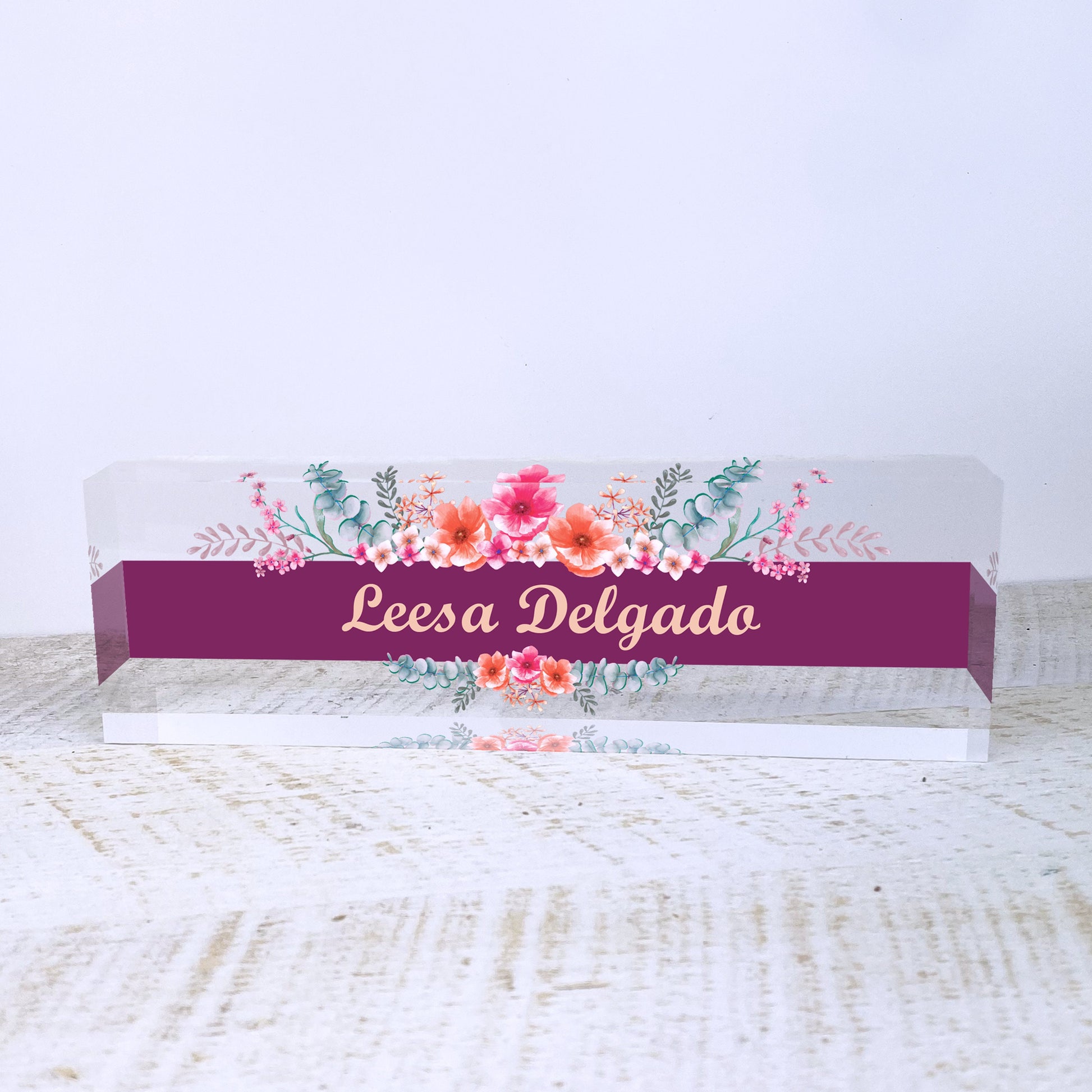 Personalized Name Plate for Desk | Wild Flowers Design On Clear Acrylic Glass | Custom Office Decor Nameplate Sign | Personalized Gift