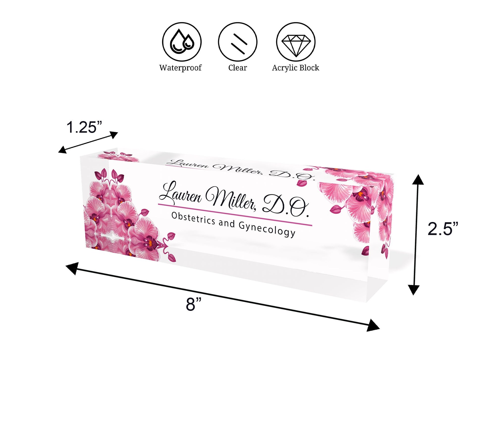 Personalized Name Plate with Wooden Base for Desk | Custom Office Decor Gift for Coworker, Pink Fower Design On Clear Acrylic