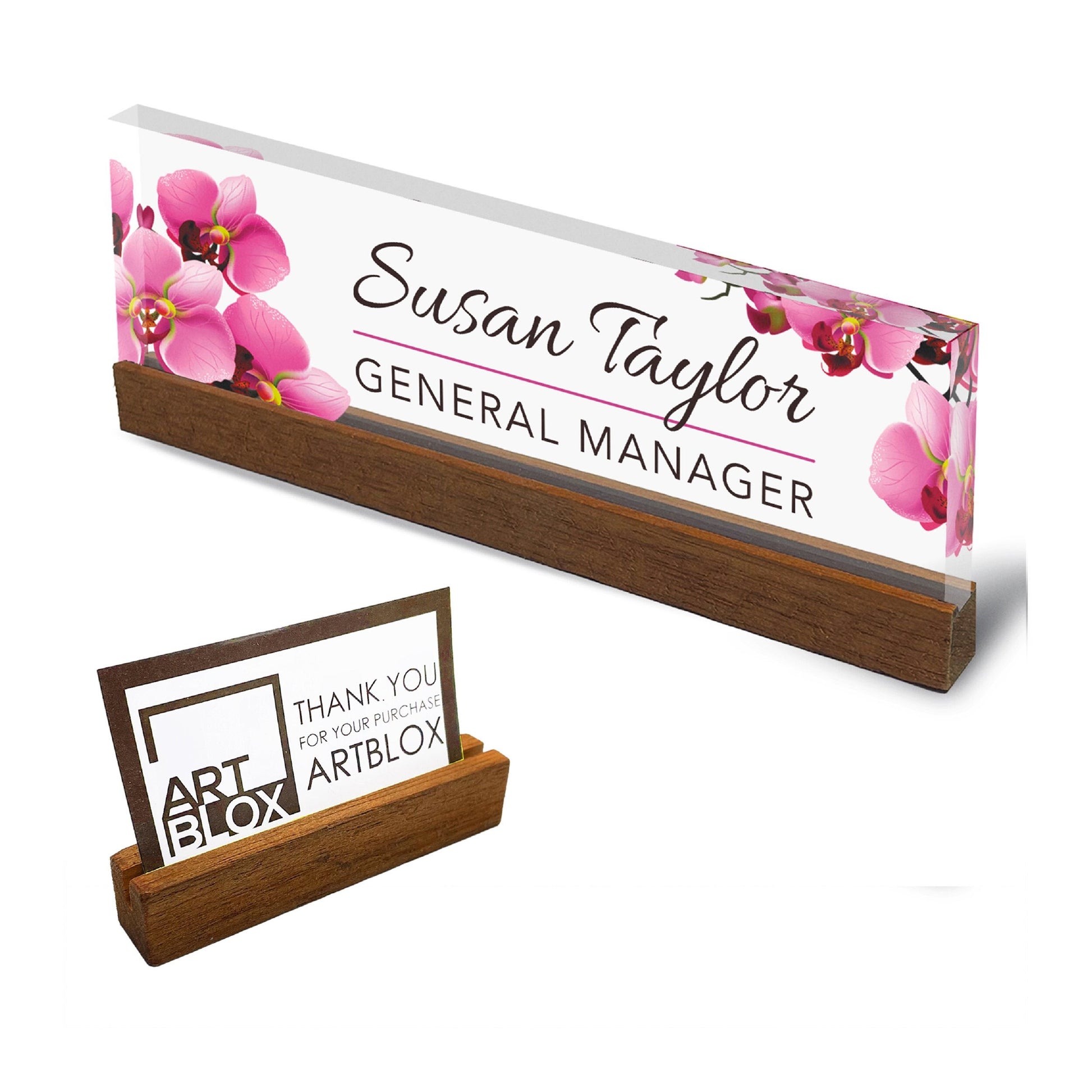 Personalized Office Desk Name Plate + Business Card Holder Customized Clear Acrylic Glass with Teak Wood Stand Orchids Flowers Design