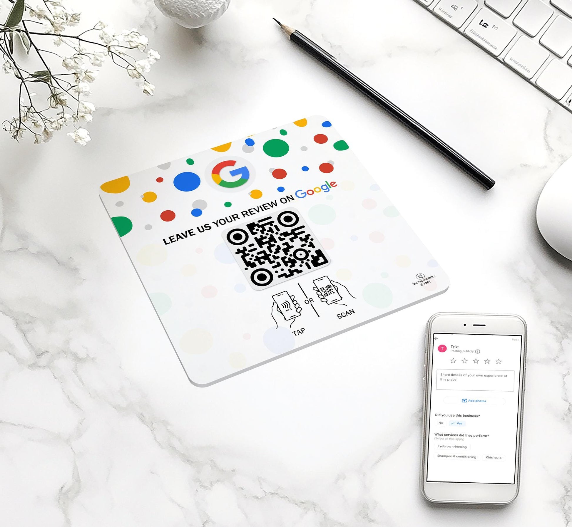 QR code signs and NFC makes it easy for your customers to quickly connect with you via social media, your website, or a custom landing page you've created while you're answering their questions about your services or products! Customers can easily access your reviews page by tapping the card and share their positive experience.
